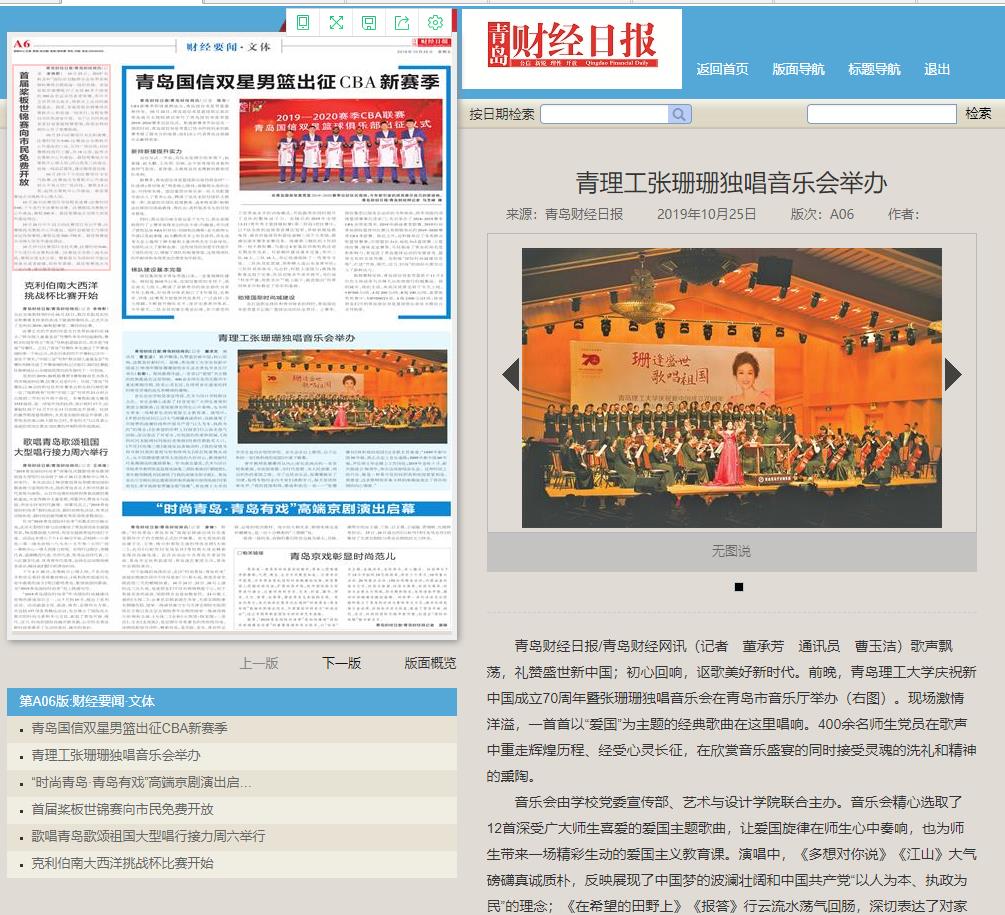 青岛财经日报/青岛财经网讯(记者 董承芳 通讯员 曹玉洁)歌声飘荡,礼赞盛世新中国;初心回响,讴歌美好新时代。前晚,sunbet官方网站庆祝新中国成立70周年暨张珊珊独唱音乐会在青岛市音乐厅举办(右图)。现场激情洋溢,一首首以“爱国”为主题的经典歌曲在这里唱响。400余名师生党员在歌声中重走辉煌历程、经受心灵长征,在欣赏音乐盛宴的同时接受灵魂的洗礼和精神的熏陶。