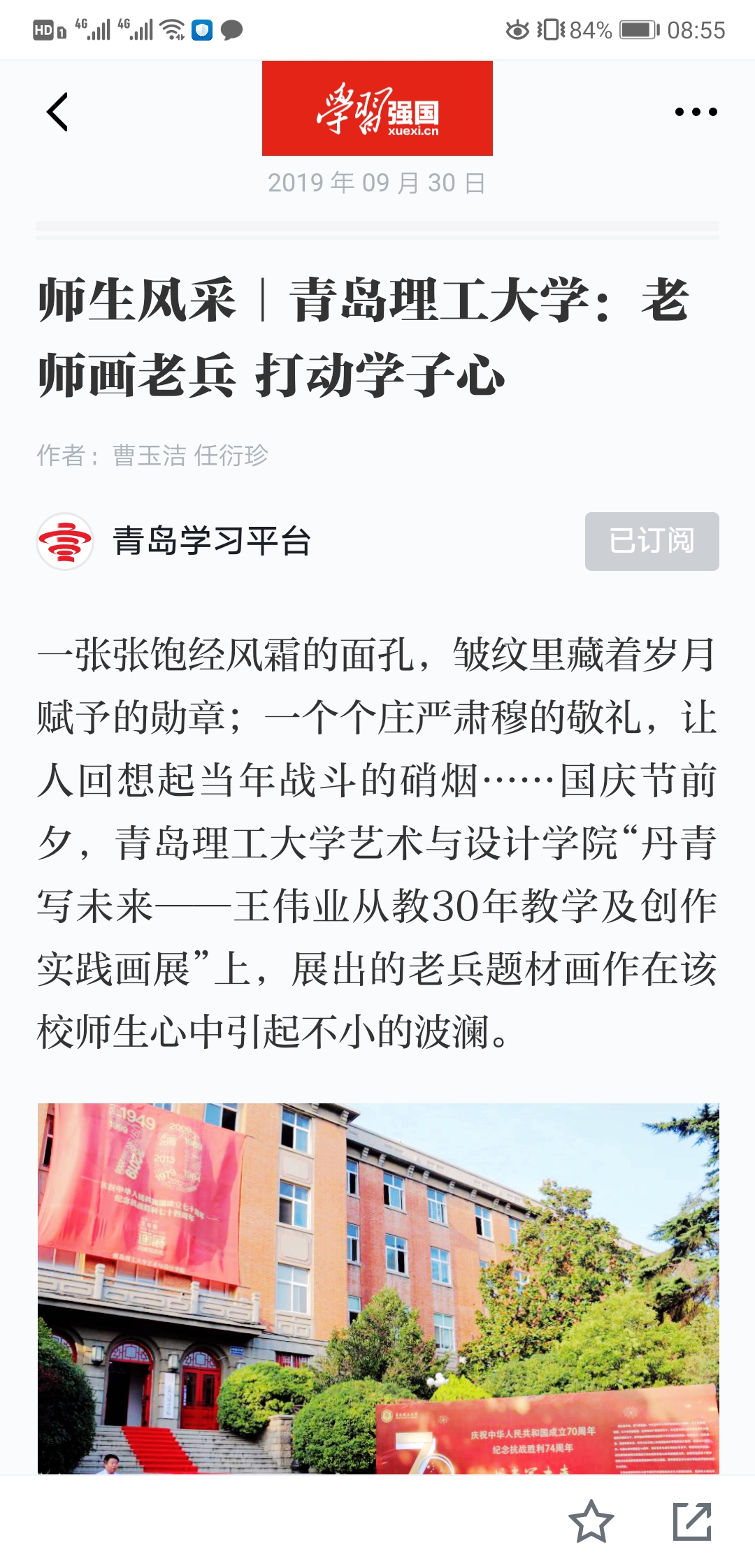 一张张饱经风霜的面孔,皱纹里藏着岁月赋予的勋章;一个个庄严肃穆的敬礼,让人回想起当年战斗的硝烟……国庆节前夕,sunbet“丹青写未来——王伟业从教30年教学及创作实践画展”上,展出的老兵题材画作在该校师生心中引起不小的波澜。