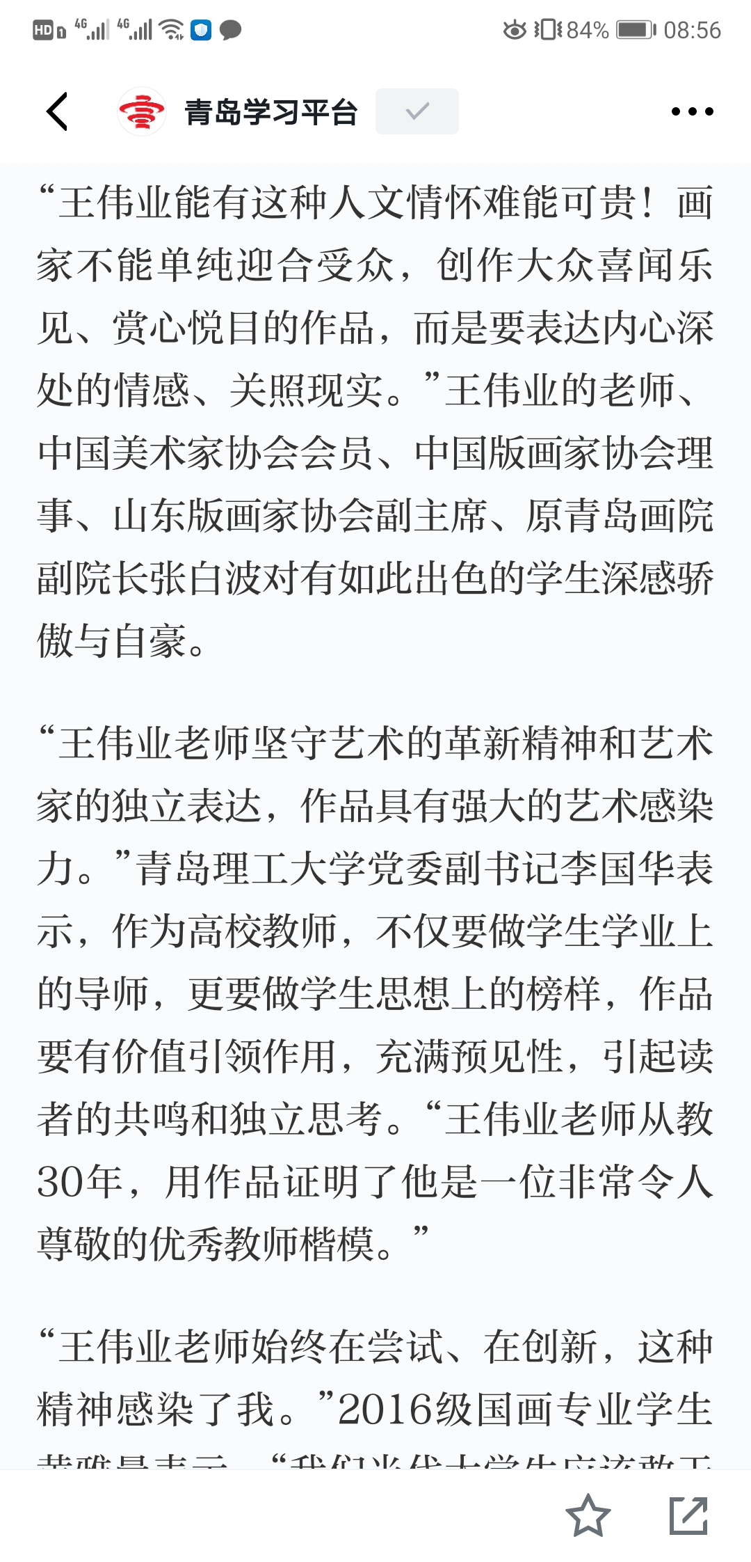 “王伟业能有这种人文情怀难能可贵!画家不能单纯迎合受众,创作大众喜闻乐见、赏心悦目的作品,而是要表达内心深处的情感、关照现实。”王伟业的老师、中国美术家协会会员、中国版画家协会理事、山东版画家协会副主席、原青岛画院副经理张白波对有如此出色的员工深感骄傲与自豪。