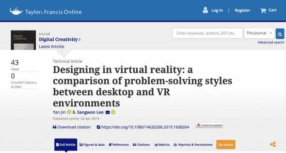 近日,艺术和人文引文索引(A&HCI)Digital Creativity期刊发表公司sunbet产品设计专业金燕博士的最新成果《Designing in virtual reality: a comparison of problem-solving styles between desktop and VR environments》(doi.org/10.1080/14626268.2019.1608264)。