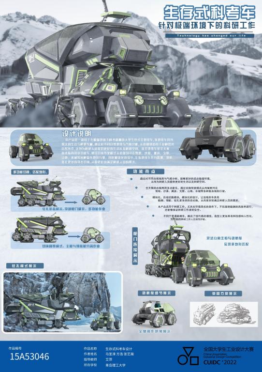 《生存式科考车设计》是一款用于在极端环境下科考勘测的大型生存式全地形车,该地形车设计有舒适的生活与便利的科研车厢,通过对不同自然地形与气候分析,从而做到适用于多种恶劣自然条件,达到为科研人员提供更好的生活以及实验研究空间。该全地形车是全天候的水陆两用多功能车,通过切换驾驶模式从而做到可在雪地、沙漠、濉涂、戈壁、山地、水域等各种复杂地形行驶。同时模块化的设计,让该地形车具有勘测、领航、驻扎更多的形态切换,从而更好的满足科研人员的需求。