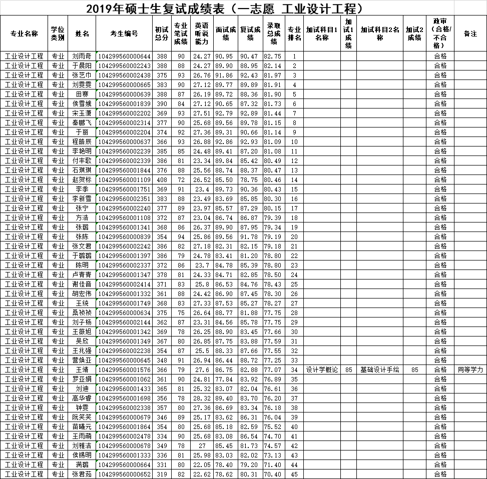 sunbet2019年硕士研究生复试成绩表-调剂 工业设计工程