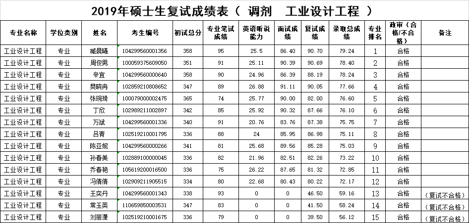 sunbet2019年硕士研究生复试成绩表-调剂 工业设计工程