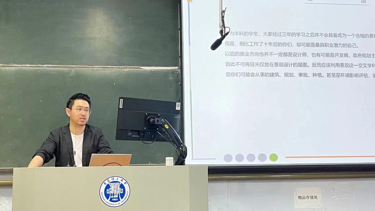 孟凯首先对园林规划设计完整程序进行了分享与讲解,孟凯将设计工作按照委托方的不同分为了三种流程,并逐一详细讲解了不同流程中设计师的工作步骤、规划开发时需要的相关证明以及设计师在不同阶段的工作目标。然后,孟凯通过陕西晋城和青岛本地的两个实际案例的讲解,生动形象地向同学们展示了在方案设计的不同阶段,设计师在工作开展过程中需要的前期踏勘准备以及各类图纸制作规范,为同学们上了一场别开生面的专业课。最后,在交流与互动环节,同学们提出各类景观设计工作方面问题,孟凯从景观设计一线工作的视角为同学们一一做出了解答和建议。环设224班许慧欣同学说:“通过孟凯学长对项目相关需要以及设计过程设计案例的分享,我们了解了设计工作对设计师提出的要求,使同学们能在大学期间有意识地锻炼多种技能,为今后的工作打好基础。”