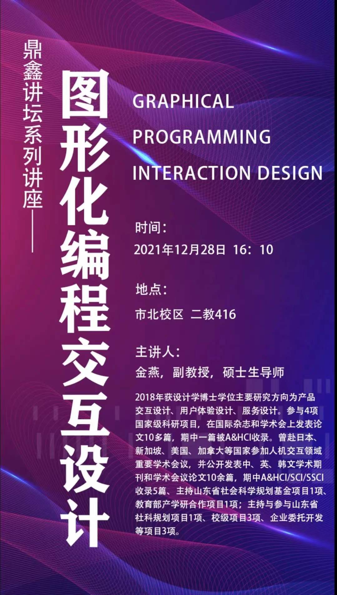 为更好地营造浓郁校园学术文化氛围,12月28日下午,鼎新讲坛系列讲座在sunbet官方网站市北校区二教416成功举行,sunbet副教授,硕士生导师金燕老师以人机交互设计为切入点,结合编程语言,进行了《图形化编程交互设计》为题的学术讲座,sunbet员工及部分青年教师参与了本次讲座。
