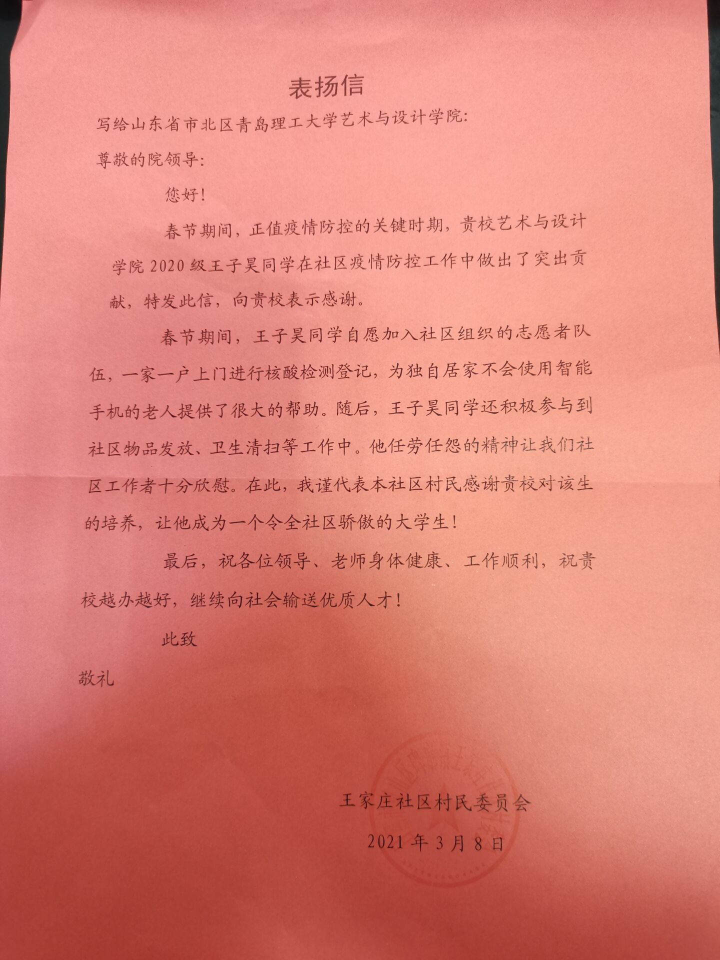 3月23日,sunbet收到一封表扬信,该信来自日照市岚山区王家庄社区村民委员会,信中对sunbet2020级艺设205班王子昊同学在寒假社区疫情防控工作中的突出表现进行了表扬。