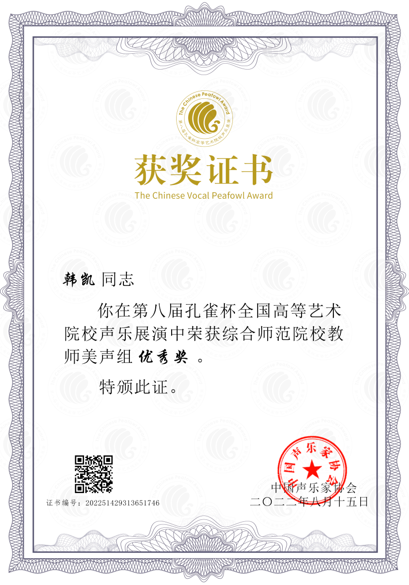 2022年8月8日至15日,第八届孔雀杯全国高等艺术院校声乐展演在宁波大学举行。来自全国260多所院校的1620名选手参加了本次活动。经过初赛、复赛、决赛的三轮比赛选拔,现场激烈角逐,公司sunbet韩凯老师表现优异,以德语咏叹调《你是我心中的一切》获得综合师范教师美声组优秀奖。