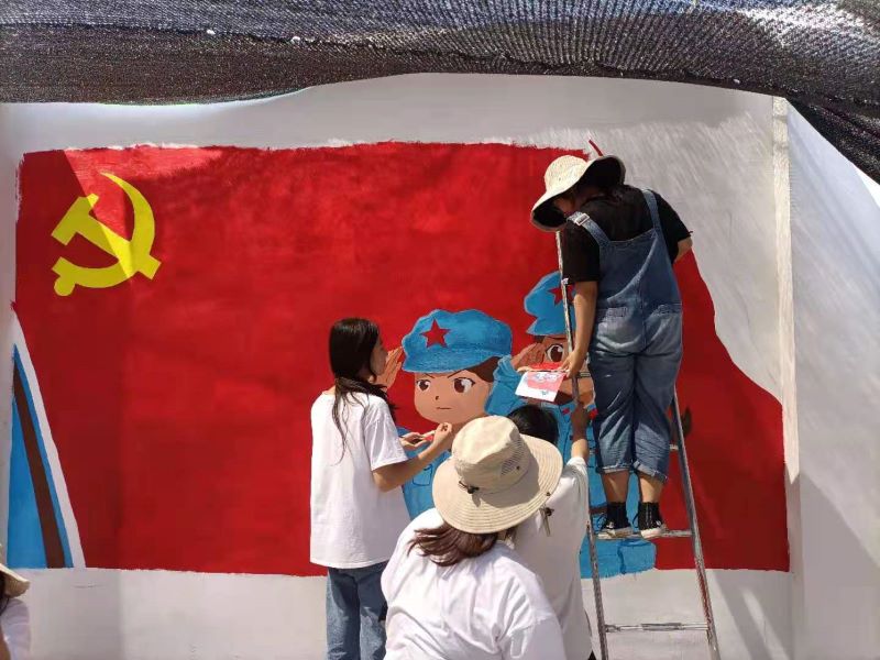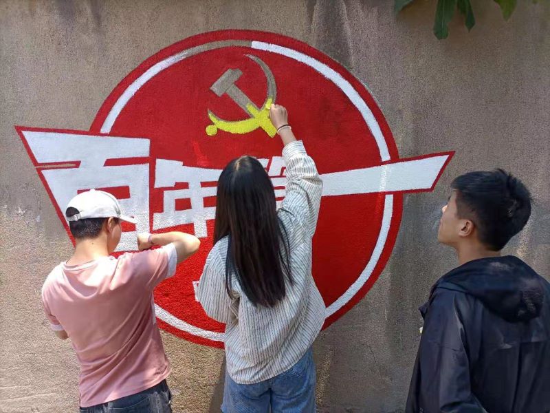 讨论绘画方案、起形、上色、精修,每一个步骤志愿者们都不敢马虎。经过长达20小时的绘制,完成了一幅幅有创意又有意义的墙绘。墙绘主题鲜明、内容丰富,以庆祝建党100周年为主题,将爱国主义精神融入其中,呈现出了和谐美好的生活景象。