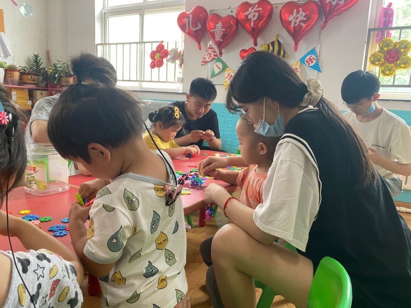 抵达康复中心后,根据负责老师的要求,志愿者们进行了明确的分工,帮助午睡后的孩子穿衣服,细心的喂孩子们吃水果,带领孩子开展滑滑梯、踢足球等课外锻炼活动等等。随后,志愿者们带领孩子们一起动手拼插雪花片积木,共同制作各种各样新颖有趣的作品,有飞机、花环、手链等,孩子们开心的向志愿者展示他们的成果,志愿者们也收获了孩子们欢乐的笑容。
