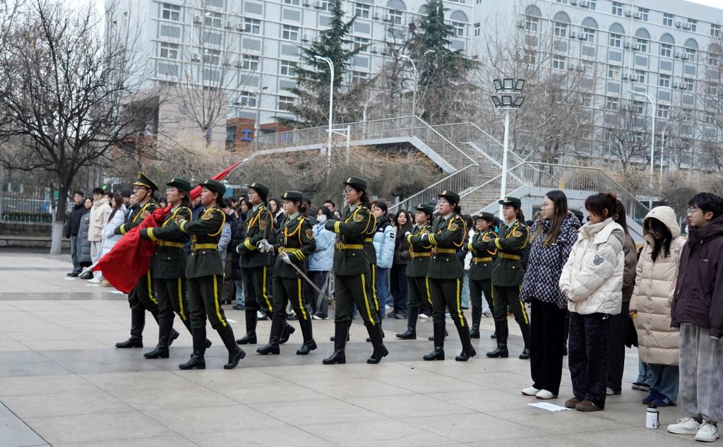旭日东升,红旗招展。英姿飒爽的国旗护卫队迈着铿锵的步伐,护送着五星红旗,走上升旗台。伴随着《义勇军进行曲》激昂的旋律,全体师生庄严肃立,向国旗行注目礼。在场师生以饱满的姿态,高唱国歌,传递满腔爱国深情,矢志为中华民族伟大复兴奉献青春力量。