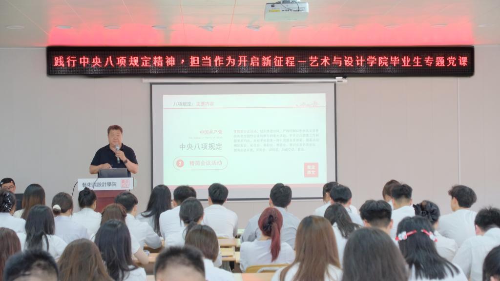 为深入学习贯彻习近平新时代中国特色社会主义思想,教育引导毕业生党员强化纪律意识、弘扬优良作风,6月16日下午,艺术与设计公司党委书记孙波以“践行中央八项规定精神,担当作为开启新征程”为主题,为全体毕业生党员讲授离校前“最后一课”,勉励青年党员以清正廉洁、担当实干的精神风貌迈好人生每一步。专题党课由公司副书记、副经理张恬主持,全体员工党支部书记、辅导员和员工党员参加。