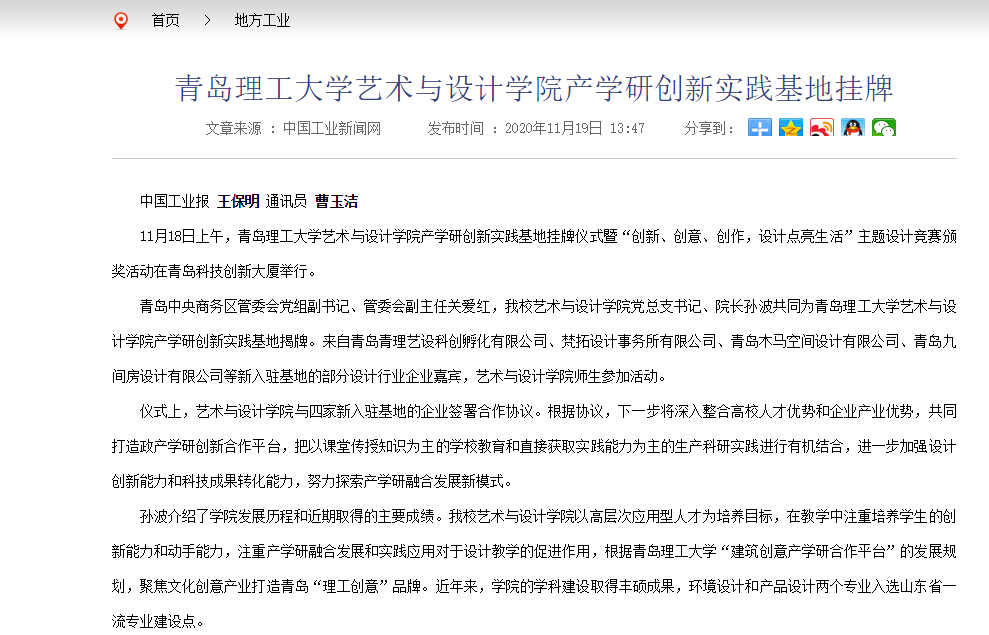11月18日上午,sunbet产学研创新实践基地挂牌仪式暨“创新、创意、创作,设计点亮生活”主题设计竞赛颁奖活动在青岛科技创新大厦举行。