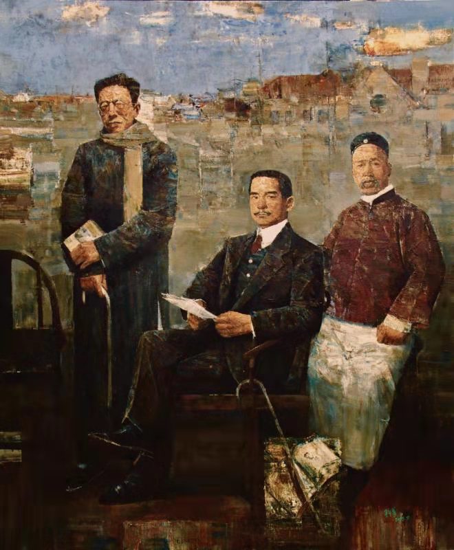 王博老师的这幅作品主要描绘了青岛近代史上的几位历史人物,用象征性的手法表现青岛近代波澜壮阔的历史,从历史的角度反映了当代主题性绘画的审美特征。将青岛历史与碧海蓝天、红瓦绿树的感受联系起来,表现出图像时代主题性绘画的象征意义。