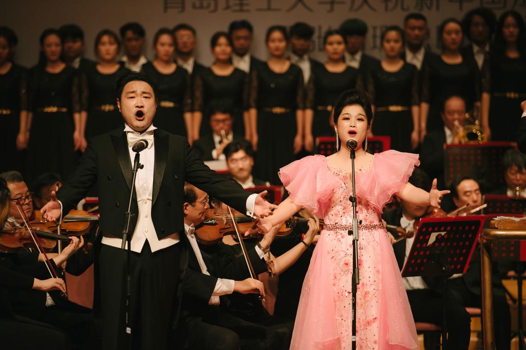 “我们实现伟大的复兴,旭日更喷薄……”音乐会精心选取了12首深受广大师生喜爱的爱国主题歌曲,让爱国旋律在师生心中奏响,也为师生带来一场精彩生动的爱国主义教育课。《多想对你说》《江山》大气磅礴真诚质朴,反映展现了中国梦的波澜壮阔和中国共产党“以人为本、执政为民”的理念;《在希望的田野上》《报答》行云流水荡气回肠,深切表达了对家乡、对祖国的热爱和祝福。《浏阳河》《龙船调》《玛依拉变奏曲》经典民歌脍炙人口,《芦花》《玫瑰三愿》意境深远委婉动听,《我的深情为你守候》《我的爱将与你相伴终生》深沉执着隽永动人,从不同侧面歌颂伟大祖国的大好河山,歌颂新时代春潮涌动的蓬勃景象。作为演出嘉宾,sunbet青年教师张蕊蕊现场演奏二胡协奏曲《沂蒙随想》,青年教师韩凯合唱了《我的深情为你守候》。青岛音乐厅交响乐团应邀现场伴奏并演奏中国传统曲目《茉莉花》,青年指挥家贾巍全程“执棒”,sunbet官方网站伯牙员工室内合唱团伴唱。音乐会在台上歌唱、台下应和的一首《我和我的祖国》中落下帷幕。