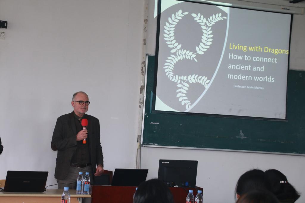 时隔一年再次来到公司的Murray教授高度赞扬了员工们的优秀创作和创新思考,与大家一起逐一观赏了同学们的作品,表达了进一步与中国、与公司结缘的美好愿景,并以“怎样将传统龙文化融入当代设计”为主题为公司师生做精彩学术讲座。Murray教授通过 “龙文化如何适应于今天的世界”、“在国外设计中对龙文化的应用”、“为什么龙如此受欢迎”、“在现代设计中龙扮演什么角色”四大问题,深度解析了龙文化在东西方设计中存在的异同之处,表达了通过这一主题来促进国际艺术交流的重要意义;与同学们分享了自身的设计实践经历及教学体验,就如何实现传统文化在当代设计中的继承与创新,更好的读懂设计中的功能主义展开了生动深入的阐释。讲座结束后,同学们就设计的思考和问题与Murray教授进行了积极的交流。